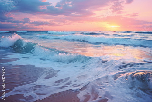 Morning waves, painted in hues of soft pastels, embrace the dawn with a tranquil embrace, welcoming a new day on the water. Concept of the serenity of sunrise over the ocean. Generative Ai.