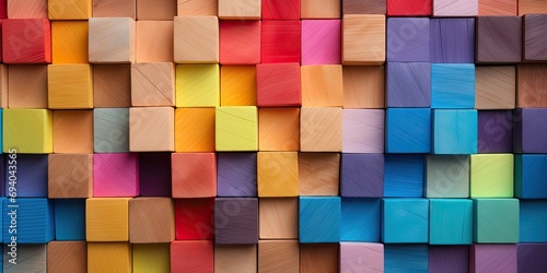 Mosaic of colorful wood blocks in rainbow pattern. Tiles stacked in abstract wallpaper background.