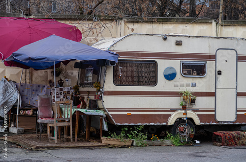 car, transport, van, trailer, house, shelter, burrow, flock, barn, old, abandoned, shabby, outcast, independent, free, holiday maker, traveler, man, style, dump, background, design, selective focus, umbrella, canopy, roof, playground, chair, life, personal, everyday, intimate, outside, without, comfort, atmosphere, vintage, past
