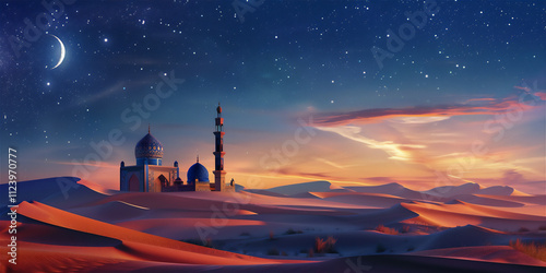 Mosque in beautiful landscape for Islamic greeting background, version 54