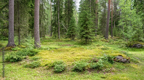 forest, moss, tree, green, nature, lush, ground, sunlight, plant, outdoors, wilderness, pine, dense, tranquil, calm, scenic, scenery, wild, flora, evergreen, landscape, wood, path, rocky, underbrush, growth, earth, calmness, quiet, shady, vegetation, area, peace, fresh, natural