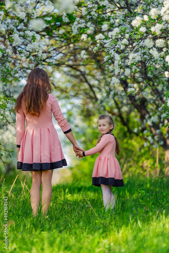 mother and daughter are walking through the blooming garden