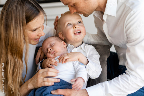 mother, father, taking, care, baby, boy, sitting, chair, home, family, 4, people, adult, children, group, woman, man, day, baby, sleeping, sleep, bonding, sibling, armchair, toddler, love, positive, emotion, mid, son, brother, togetherness, caucasian, babyhood, male, female
