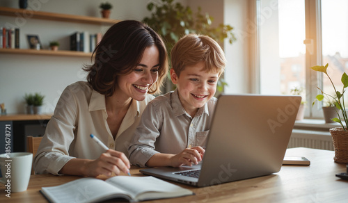 Mother and Son Collaborating on Laptop Project – Smiling Woman and Boy in Home Office for Freelance Work, Remote Education, and Family Teamwork Concepts