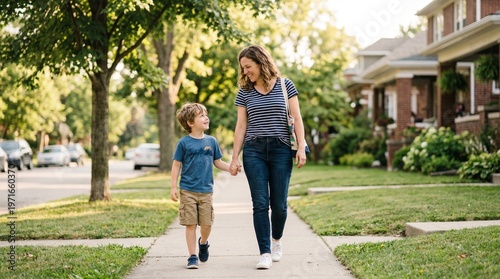 Mother and son holding hands walking on suburban sidewalk at golden hour in summer
