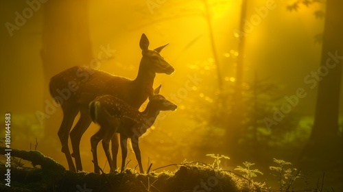 mother, cervid, fawn, gold, light, backlit, doe, spotted, misty, forest, dawn, wildlife, nature, wood, silhouette, mist, fog, sunlight, ray, aethereal, peaceful, serene, maternal, animal, mammal, spot, fern, moss, underbrush, bokeh, cinematic, background, scenic, habitat, outdoors, tranquil, soft, warm, shadow, contrast