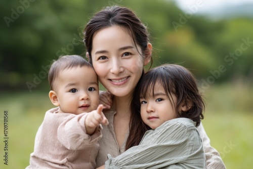 Mother enjoys outdoor time with her young children in a green park during a sunny day