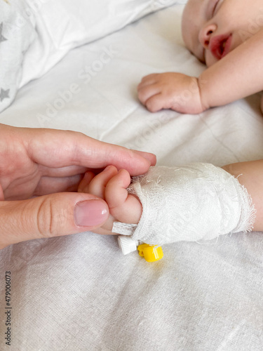 Mother holding child's hand who fever patients in hospital to give encouragement.