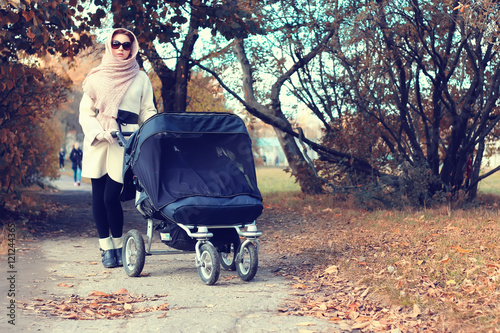 mother in a park stroller autumn