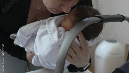 Mother putting newborn baby in portable seat with gentle care. attentive parent takes care of her infant during first days of life