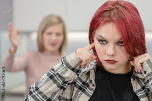 Mother scolds her teen daughter. Girl plugged her ears and ignores her mother. Family relationships concept