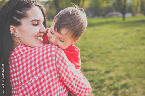 mother with child smiling in the park. hipster style. casual clothes. concept of happy family