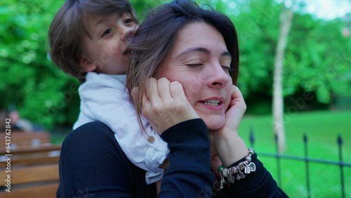Motherhood moment of little boy hanging on mom's back in open air outside, kissing and hugging mom in authentic love and affection. Caring small boy embraces and kisses parent