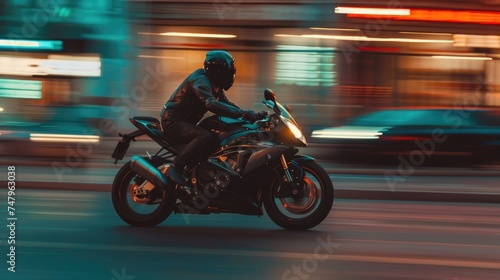 Motorbike rider drive very fast. Cool motorcyclist ride motor bike. Blur city background. Fast speed concept. Brutal biker on motorcycle. Extreme racer journey. Moto adrenaline. Urban road way.