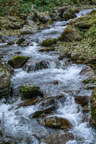 Mountain Beshenka river among stones and trees in Krasnaya Polyana near Sochi. Beautiful landscape rapid river with small waterfalls.