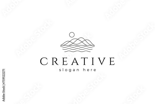 Mountain icon line art outline logo design with lake under sunlight