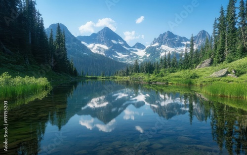 Mountain Lake Reflection with Snow-Capped Peaks and Lush Green Forest.