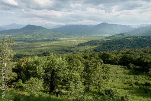 Mountain landscape with green valleys. Caucasian State Natural Biosphere Reserve named after Kh.G. Shaposhnikov. Lago-Naki plateau. Russia.