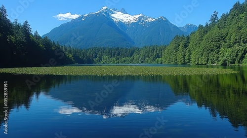 Mountain Peak Reflected in a Still Lake Surrounded by Forest
