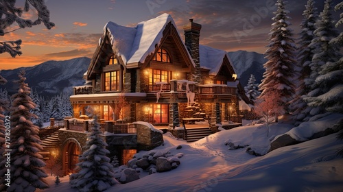 Mountain vistas, snug cabin, roaring fireplace, cozy warmth, serene ambiance, embraced by nature. Generated by AI.