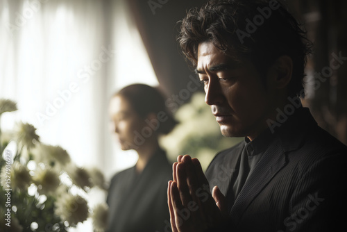 man, woman, prayer, mourning, funeral, grieved, loss, grief, flower, respect, solemn, dark, spiritual, contemplation, sorrowful, sympathy, event, asian, indoor, ceremony, ritual, peace, support, family, sombre, remembrance, introspection, emotional, faith, hope, tradition, belief, culture, silence, calm, understanding, togetherness, comfort