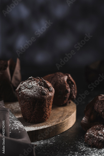 Muffins with chocolate and powdered sugar on a wooden board on a dark background. Side view close-up. Delicious dessert for breakfast with coffee or tea. Vertical orientation.