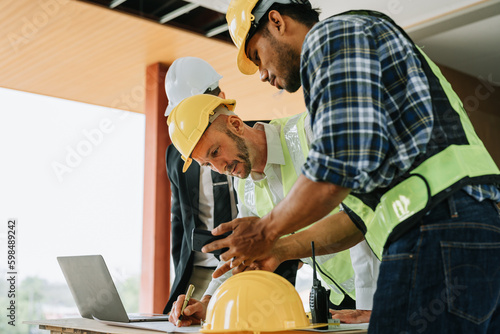multi ethnic engineer brainstorming and measuring for cost estimating on blueprint and floor plan drawings about design architectural and engineering for houses and buildings