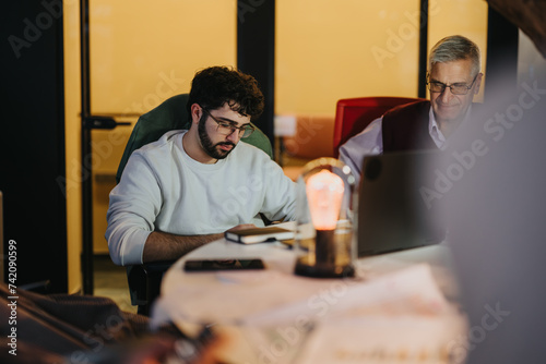 Multi generational coworkers analyze data, plan strategies, and discuss business growth in an evening meeting.