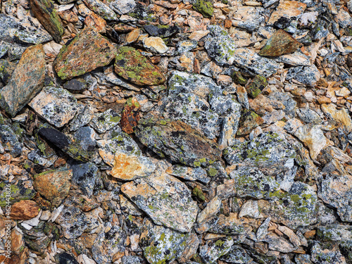 Multicolored detailed texture of a rocky mountain slope. Geological scattering of stones in close-up. Nature background of chaotic pile of stones. Minimalist texture of stony heap