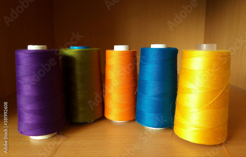 Multicolored sewing threads in bobbins stand on a brown shelf