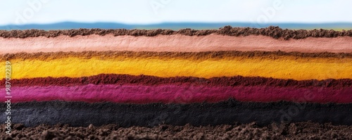 Multicolored soil layers representing different geological eras, visualizing soil history