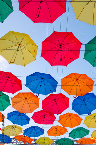 umbrella, sky, weather, city, summer, background, clear, bright, aesthetic, many-coloured, many-coloured, colours, colourful, blue, red, orange, green, soft, light, high-coloured, abstract, object, street, festive, joy, cheerful, happy, nobody, festival, project, beautiful, texture, decorative, decoration, variety, holiday, parade, urban, sunset, beauty, ornament, multitude, landmark, traditional, symbol, protect, rain, rainbow