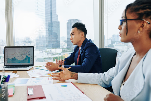 Multi-ethnic business partners discussing sales reports and results of cooperation at meeting