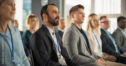 Multiethnic Male Technology Conference Attendee Sittign In Crowd And Listening to Presentation Of Innovative Gadget. Middle Eastern Man Looking For Investment Opportunities At International Tech Forum