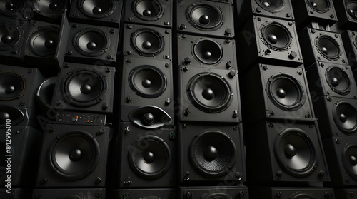 Multiple various size black Loudspeakers background, Generative.AI