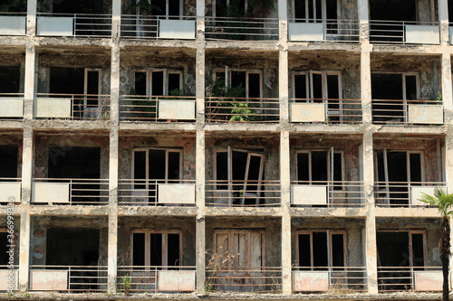 Multi-storey abandoned house without glass in the windows.