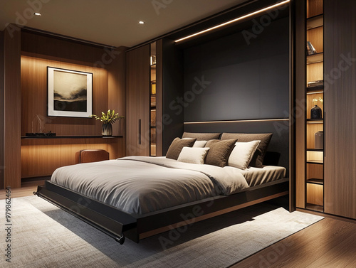 Murphy bed in a modern guest room, sleek matte black wood finish, integrated into a custom wall, luxury bedding