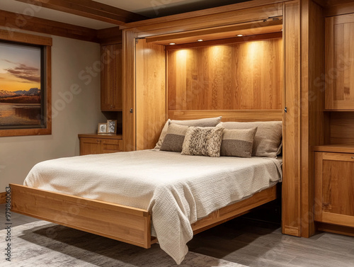 Murphy bed unfolding from a sleek wooden wall panel in a cozy studio apartment, soft beige walls, modern Scandinavian design