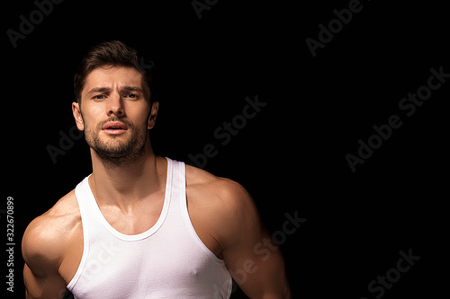 Muscle strong beautiful stripped male model with white shirt in denim gray jeans on black isolated font background