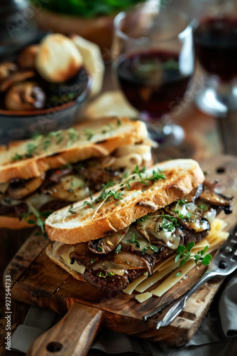 Mushroom and cheese sandwich garnished with fresh herbs, served on a wooden board with wine, evoking a cozy gourmet meal