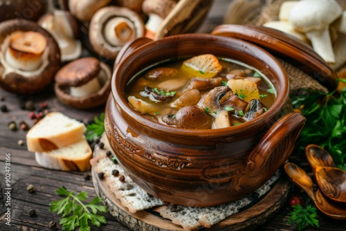 Mushrooms Cream Soup in Ceramic Pot, Homemade Creamy Soup Made of Champignons, Boletus
