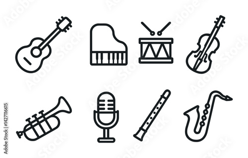 music, instrument, icon, outline, band, orchestra, symbol, minimalist, elegant, guitar, piano, drum, fiddle, trumpet, microphone, flute, saxophone, jazz, classical, concert, performance, melody, acoustic, harmony, note, festival