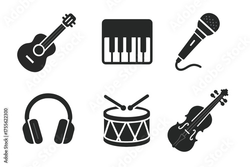 musical, instrument, icon, guitar, piano, microphone, earphones, drum, fiddle, sound, music, audio, entertainment, percussion, string, electric, acoustic, sing, rythm, melody, bass, classic, digital, performance, band, concert, harmony, beat, jazz, rock, classical, pop, folk, orchestra, vector, icon