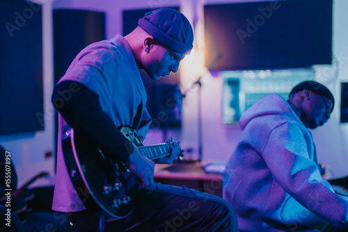Musicians working in a studio, showcasing creativity and collaboration. Engage in music production, capturing the essence of teamwork in a professional setting filled with instruments and equipment.