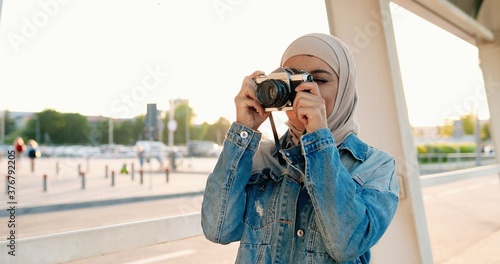 Muslim young beautiful stylish woman in traditional headscarf taking photos on vintage photo camera at street. Female in Arabic hijab making pictures while standing outdoor in city.