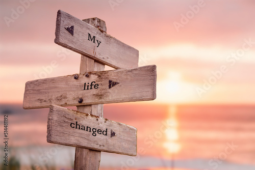 my life changed text quote on wooden crossroad signpost outdoors on beach with pink pastel sunset colors. Romantic theme.