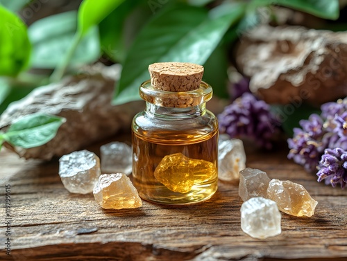 myrrh essential oil in a small glass bottle