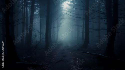 Mysterious dark woods and misty paths, perfect for a Halloween scene