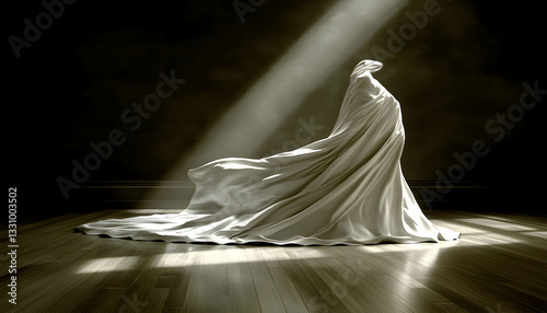 Mysterious draped fabric in a dark room, illuminated by a single light source, creating a dramatic and evocative scene.