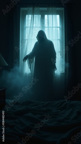 figure, shadow, curtain, room, fog, night, eerie, suspense, mysterious, atmosphere, silhouette, window, haunting, ghost, chilling, solitude, ominous, dark, cold, stillness, quiet, whisper, gaze, isolation, fear, tension, unknown, secret, unseen, obscured, light, twilight, apprehension, shadowy, presence, paranormal, challenge, curiosity